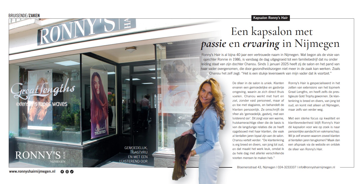 Bij Ronny’s Hair staat persoonlijke aandacht centraal. Al meer dan 40 jaar creëren we met zorg en vakmanschap de mooiste kapsels, altijd afgestemd op de wensen van onze klanten. Niet voor niets hebben we de Golden Trophy Award gewonnen voor het zetten van extensions.